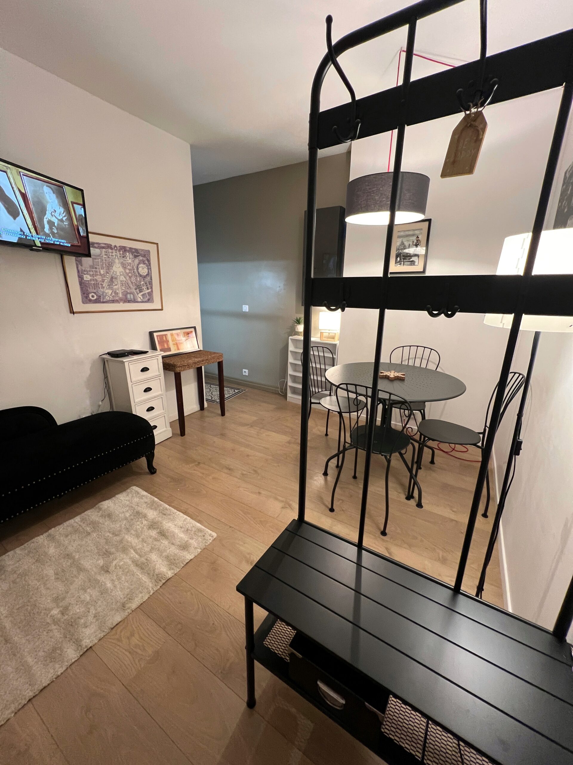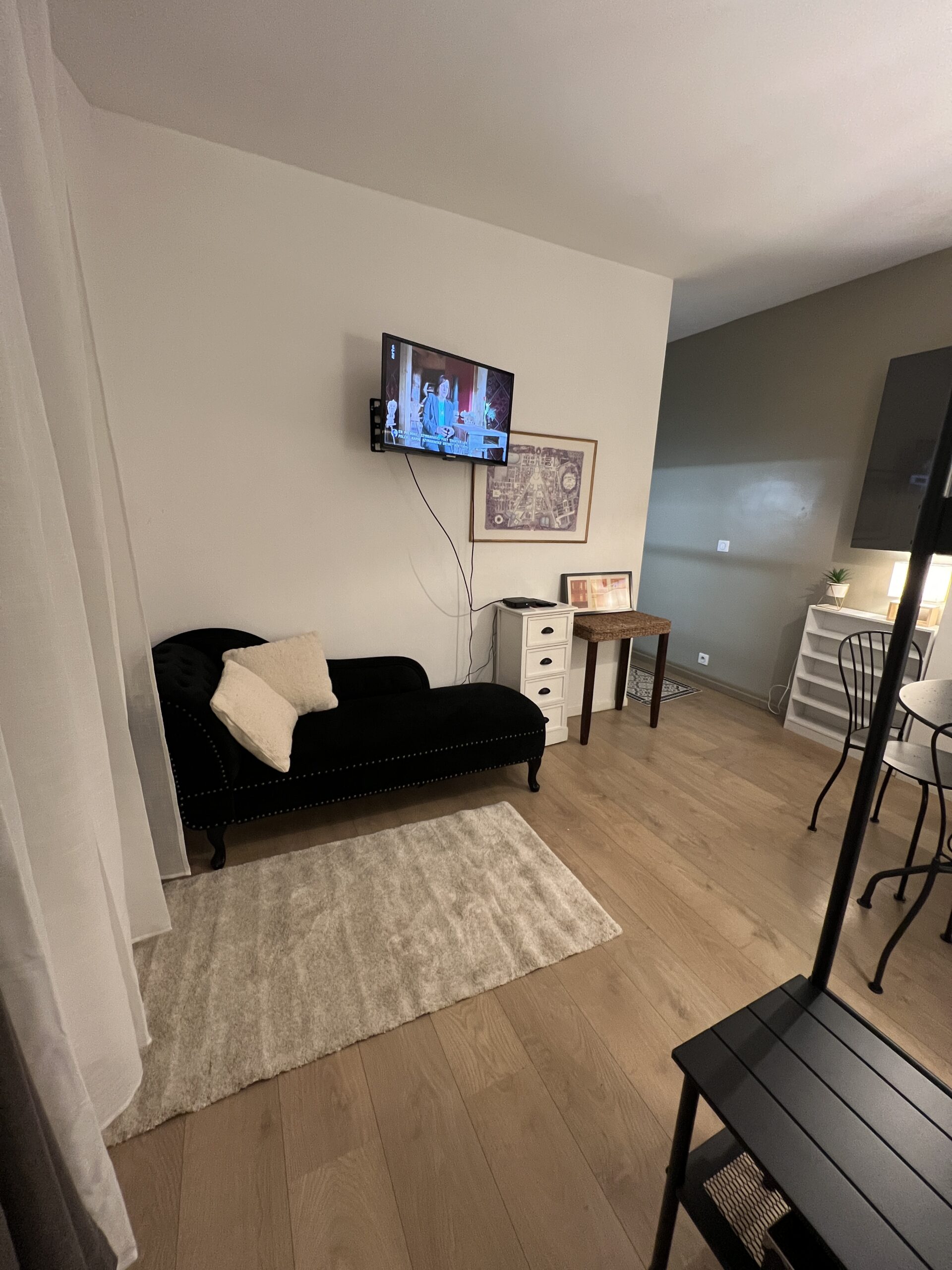 contient un canapé, des nombreux rangements (une penderie, 2 commodes), une TV écran plat (250 chaines), internet fibre, une table et sièges. Une fenêtre sur cour illumine le salon.