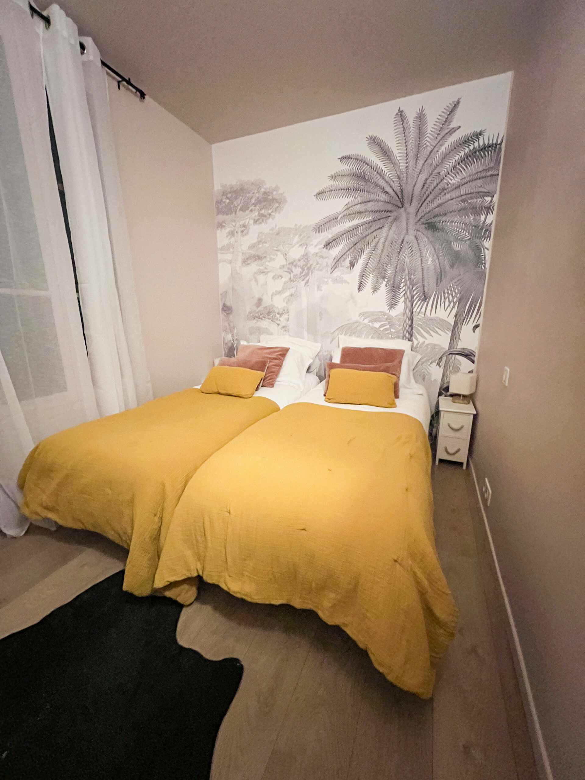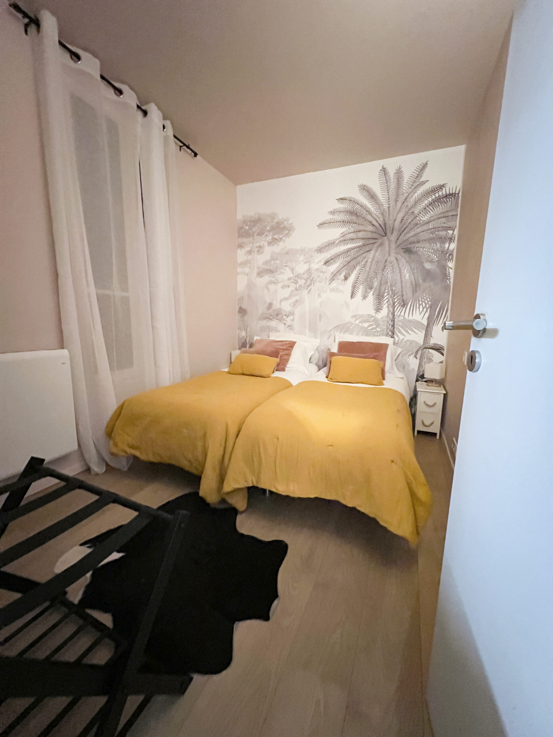 La chambre est séparée du living par un petit couloir. Elle dispose d’une fenêtre (double vitrage) et de volets sur la cour intérieure. Il y a 2 lits individuels de 90 x 200 cm qui peuvent être rassemblés. La literie est neuve. 2 couettes 140 x 200 cm (couette 1 personne), 2 oreillers, 1 oreiller « spécial cervicales » à disposition, 2 tables de nuit à tiroir encadrent les lits, 2 lampes de chevet, 1 commode semainier (commode 7 tiroirs).
