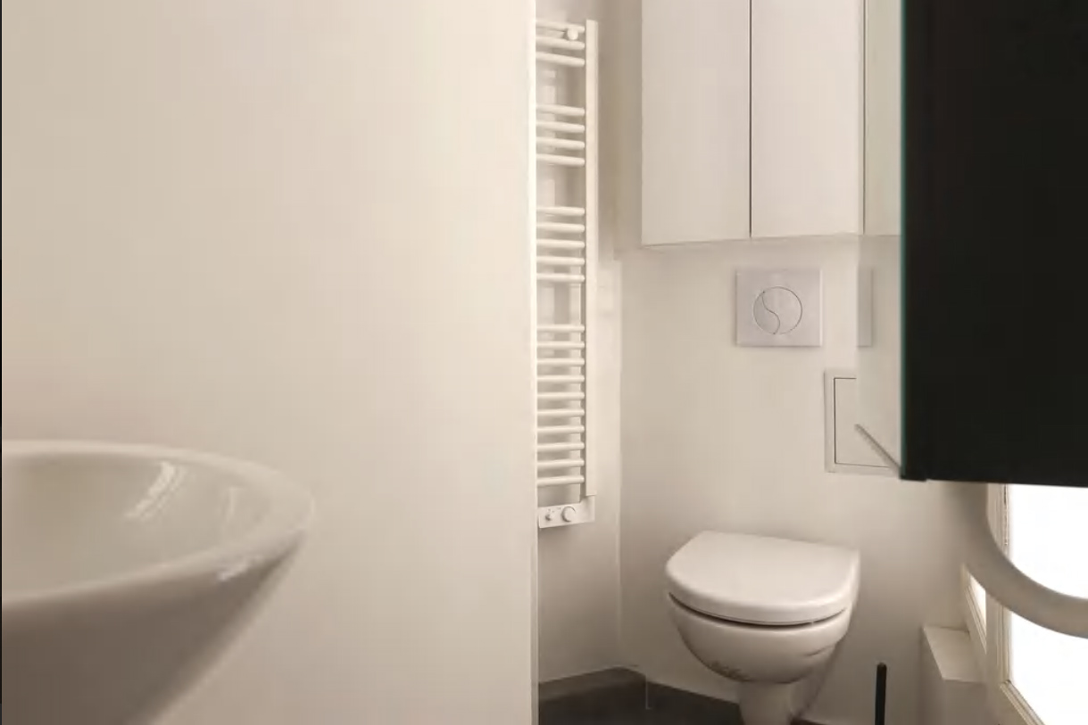 La petite salle de bains donne dans la chambre est équipée d’un lavabo, d’une douche, de WC et d’une fenêtre. Un sèche-cheveux est à votre disposition. Toilettes, carrelage, douche, robinetterie, cet espace est neuf. Douche spacieuse et robinet thermostatique + radiateur sèche-serviette, placard.